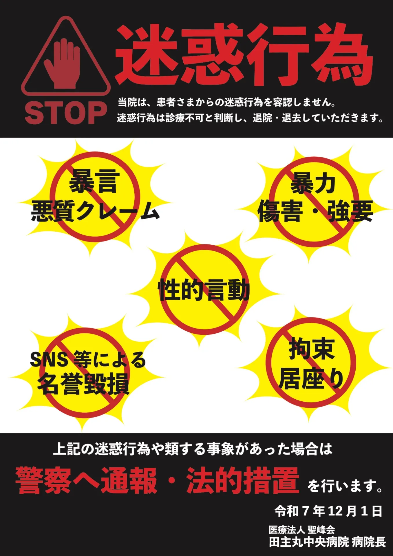 当院は、患者さまと職員が互いに尊重し合う医療環境を守るため、以下のとおり断固たる姿勢で対応いたします。