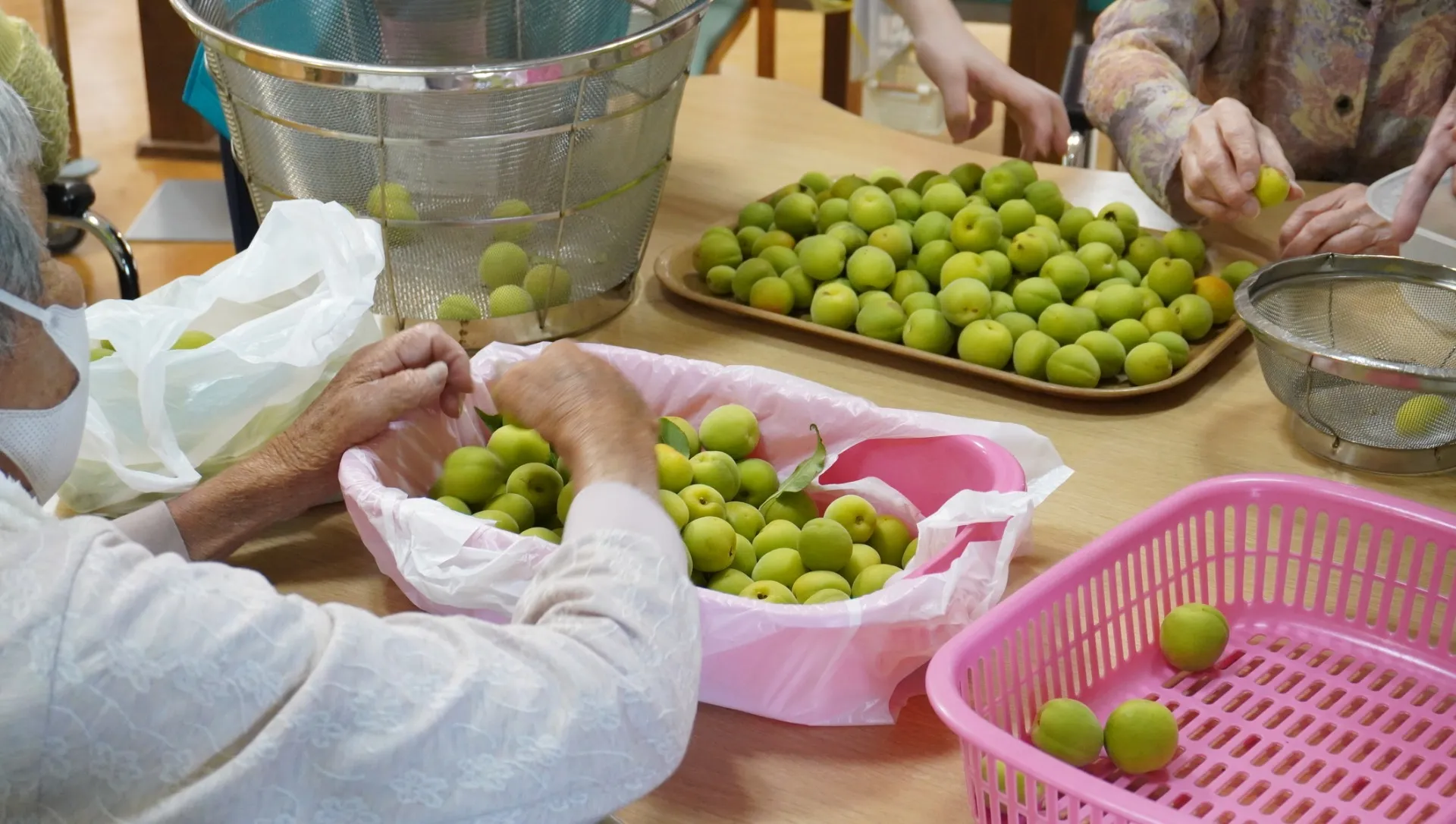 太陽が燦々と照りつける暑い中でしたので、利用者さまには麦わら帽子を被って収穫をしていただきました。今回収穫した梅はなんと16.5㎏もありました。