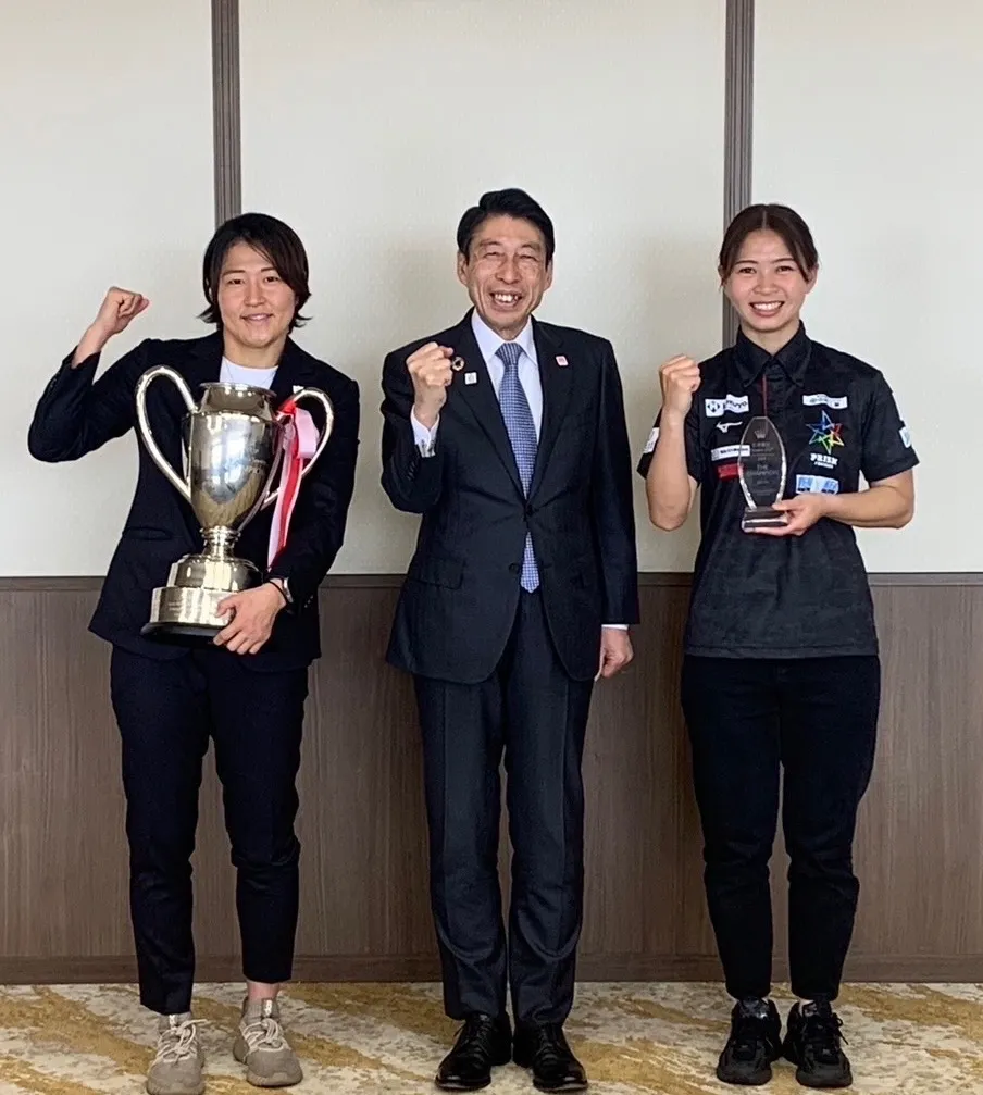 4月8日(火曜日)、当法人に勤務しているキャプテン黒田佑美選手を含む「ナナイロプリズム福岡」の4名が福岡県庁を訪問し、服部県知事に2月に開催されたナナイロカップ2025の優勝報告を行いました。