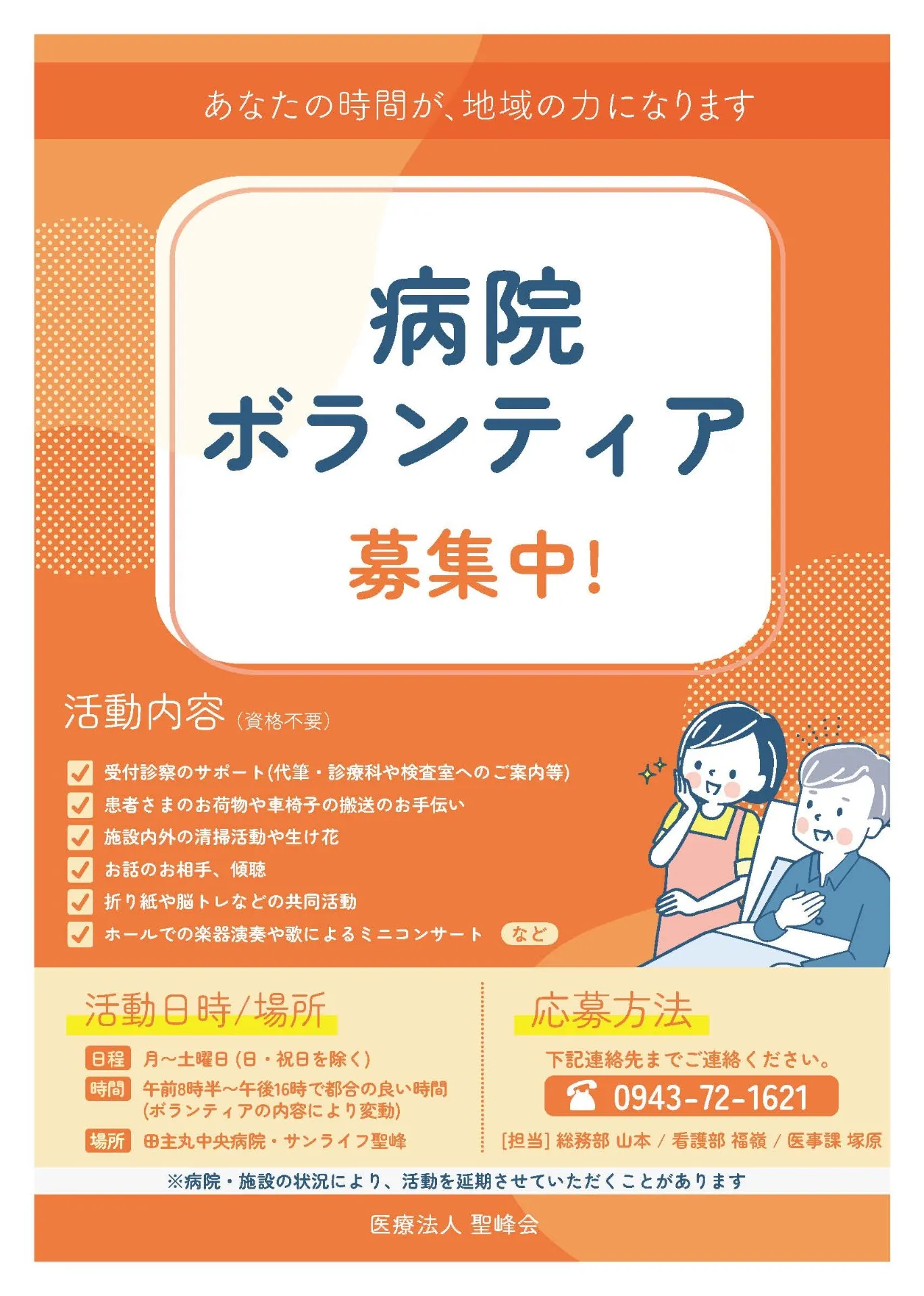 医療法人聖峰会では、地域の皆さまへより良い医療・福祉サービスを提供するため、看護師や介護士、その他の職員と協力して「患者さまが心地よく過ごせる環境づくり」のサポートを行なっていただける病院ボランティアを募集しております。