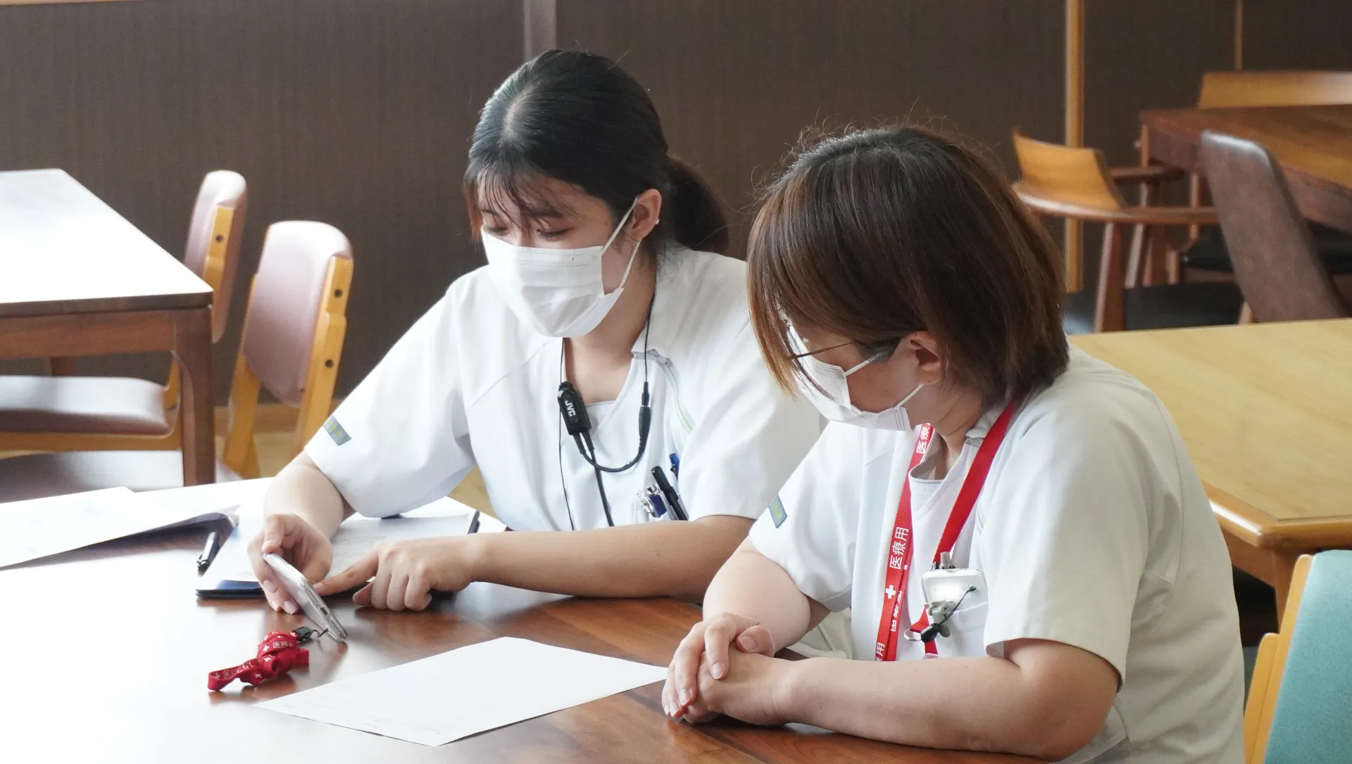 実践後にベテラン看護師とともに自身の対応の状況を視聴することにより、行動の振り返りを行いました。