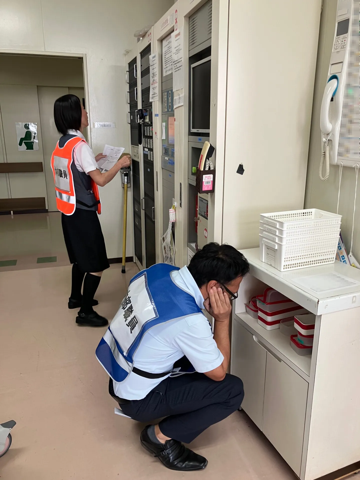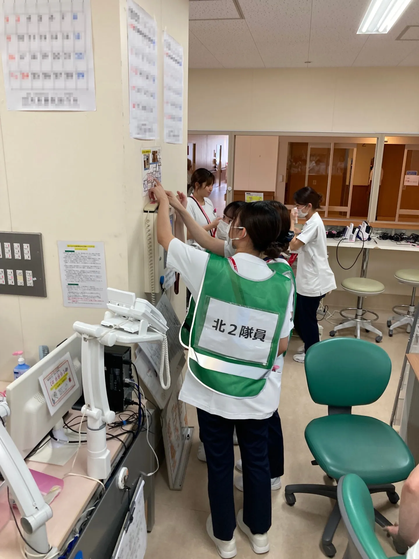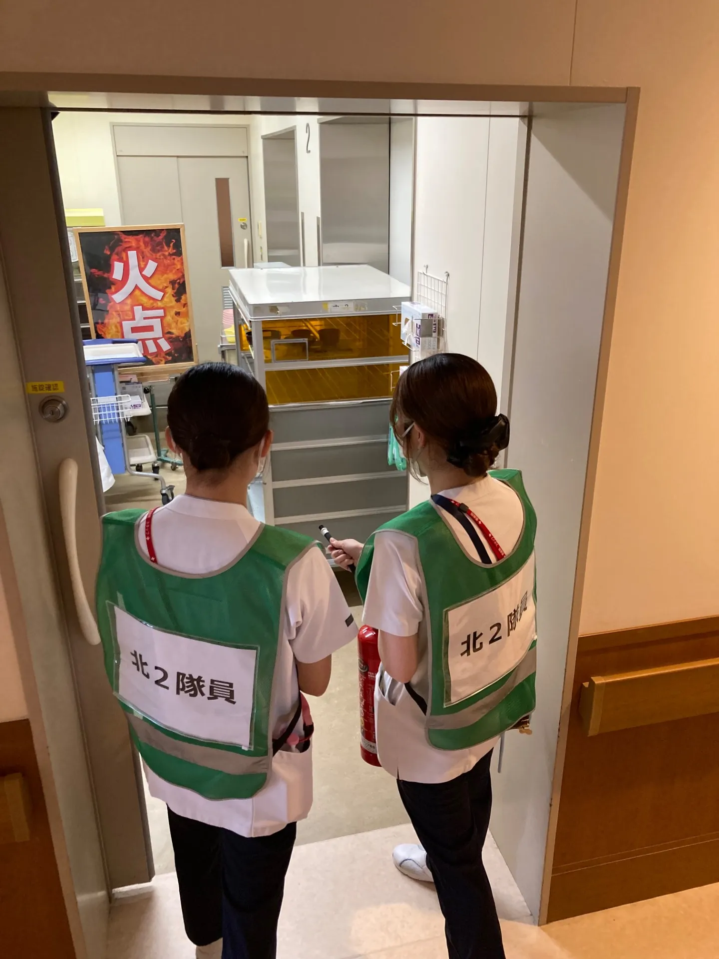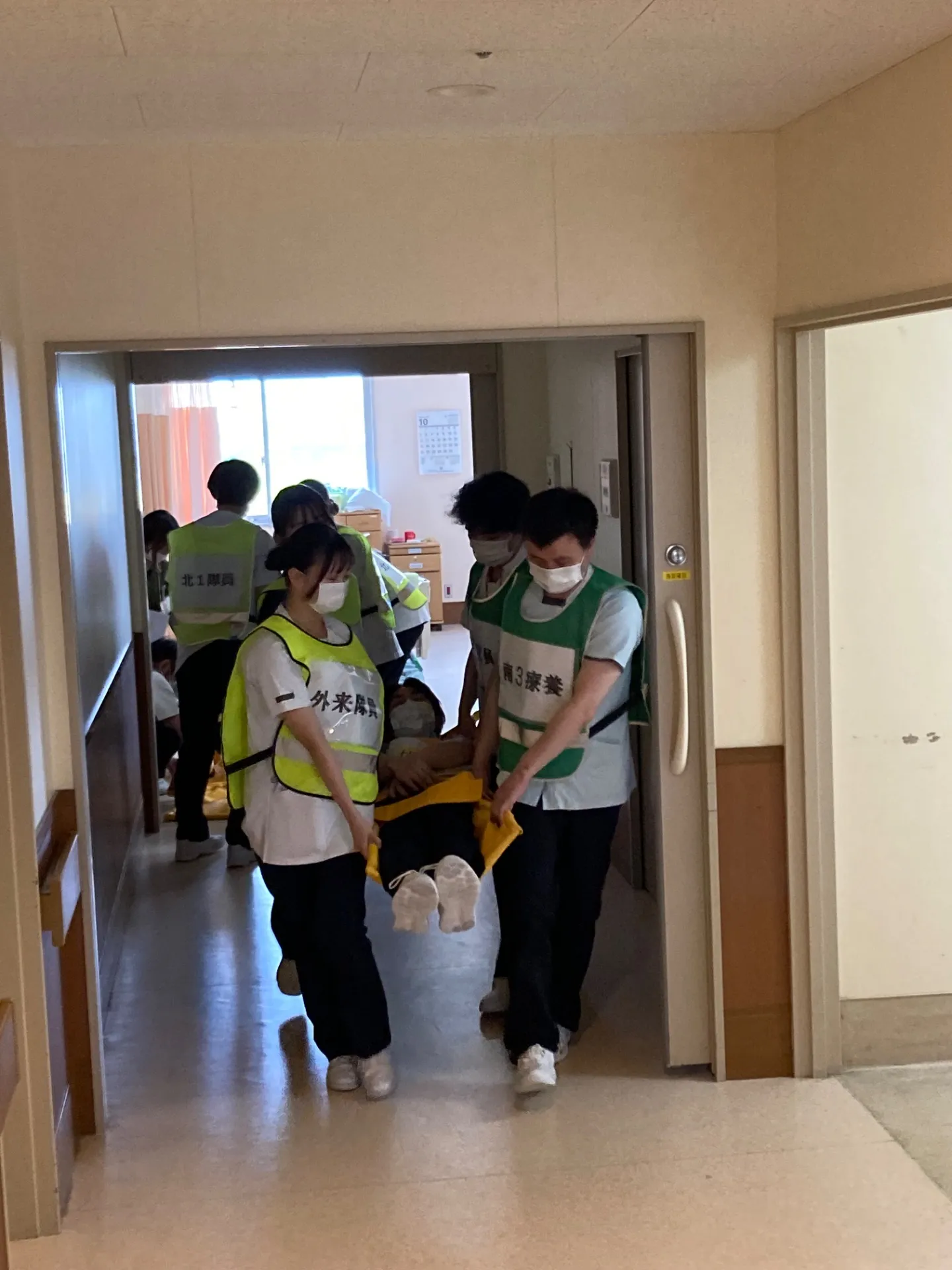 今回は「北2階病棟内で火災が発生した」という想定のもと、初期消火の対応、患者さまの避難動線の確認、救助方法の確認など、実践的な訓練が行われました。