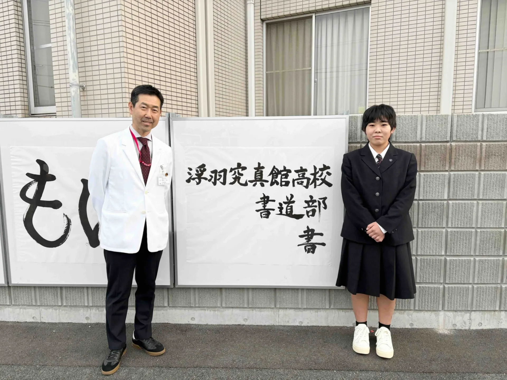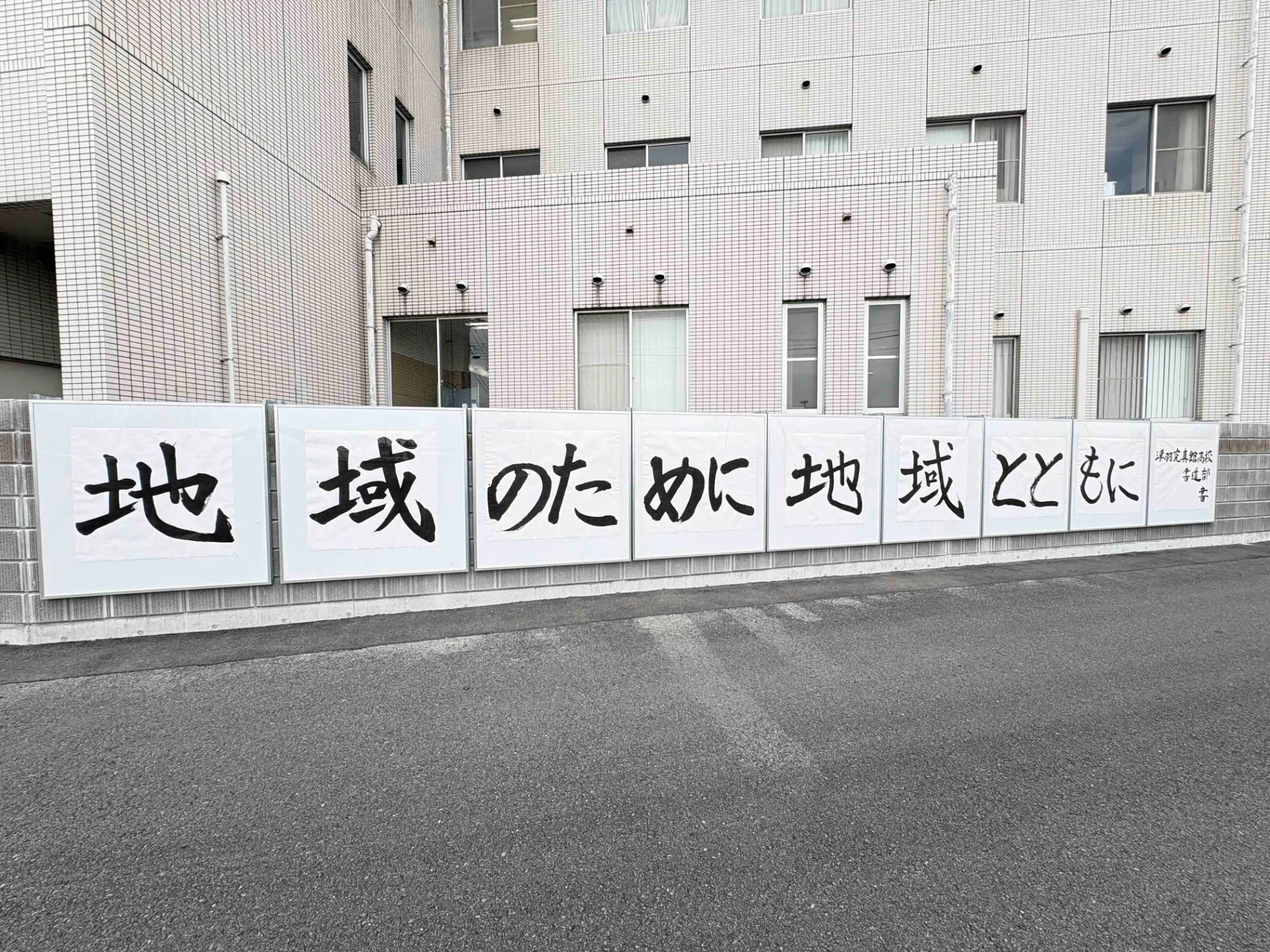 このたび、その防水壁パネルに、浮羽究真館高校 書道部の生徒さん9名が、当法人の理念である「地域のために 地域とともに」という文字を、心を込めて書いてくださいました。