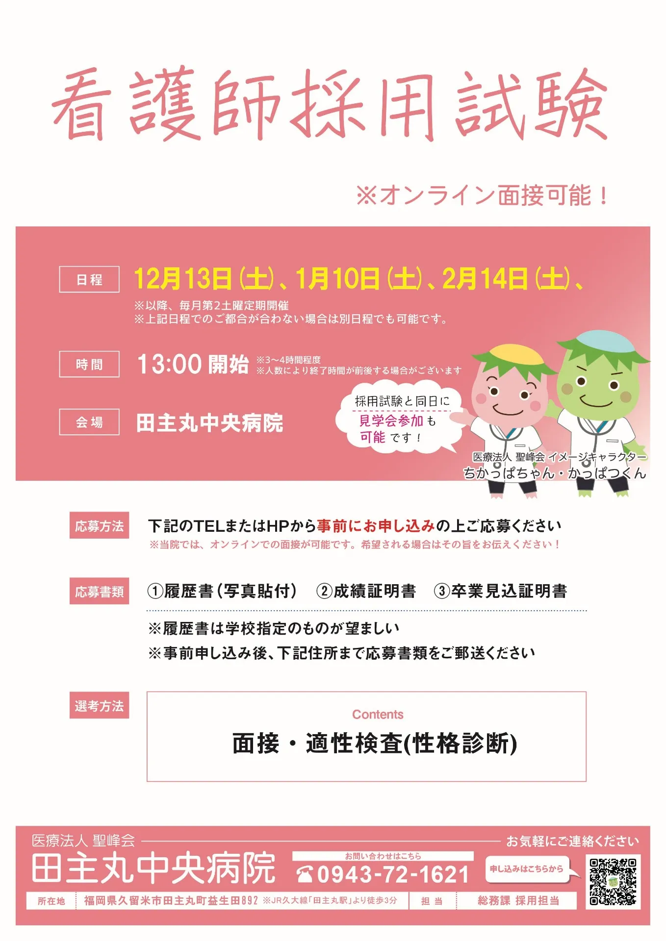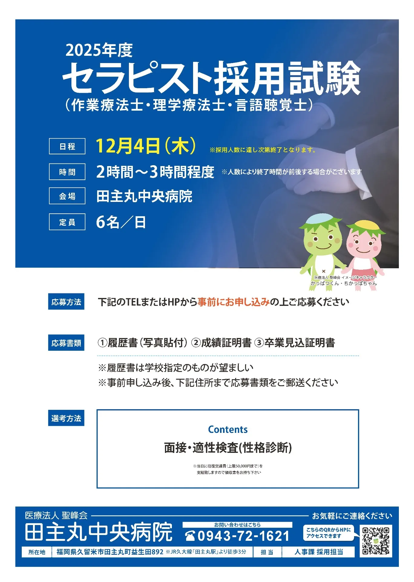 令和7年12月4日(木曜日)に、田主丸中央病院のセラピスト(PT・OT・ST)の採用選考を開催します。皆様のご応募お待ちしております!また、随時見学も受け付けておりますので、お気軽にご連絡ください。…