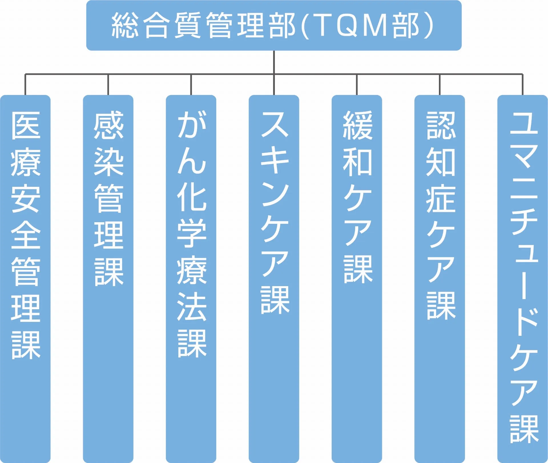 総合質管理部(TQM:Total Quality Management 部)は2023年4月より新しく設置した部署です。活動目的は、田主丸中央病院の医療の質を向上させ、安全で安心できる医療を提供し、患者さまの満足度を上げることです。また、患者さまだけではなく、スタッフの満足度も向上させることも目的の一つです。業務の効率化や有効化を目的に、継続的に改善活動を実施できるようなシステム構築を目指しています。上記のような体制のもと日々精力的に活動しています。また、2025年12月よりユマニチュードケア課を新設し、看護・ケアの質をより高めていく予定です。